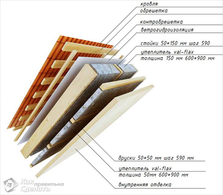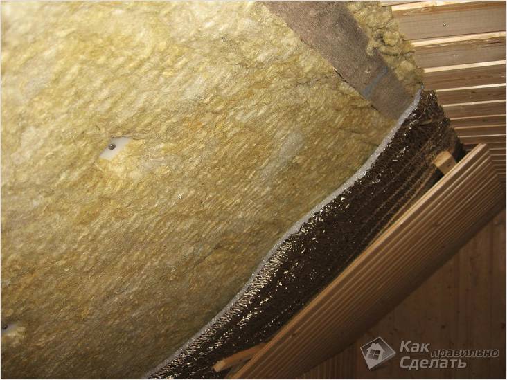 - Після влаштування гідроізоляції настає черга вкладання теплоізоляції. Цей матеріал монтується між кроквами, при цьому метод укладання матів або плит повинен припускати кілька шарів і виключати збіг стиків. Кількість шарів утеплювача повинно бути не менше двох і сумарна їх товщина повинна перевищувати 20 див. Якщо у кроквяних ніг невеликий розмір по ширині, наступним шаром можна перекрити крокви – від цього якість утеплення тільки покращиться. Після укладання утеплювача покрівельний пиріг доповнюється пароізоляційним матеріалом. Потім вся конструкція кріпиться решетування до крокв і зашивається. Така технологія утеплення застосовується при наявності скатної покрівлі.